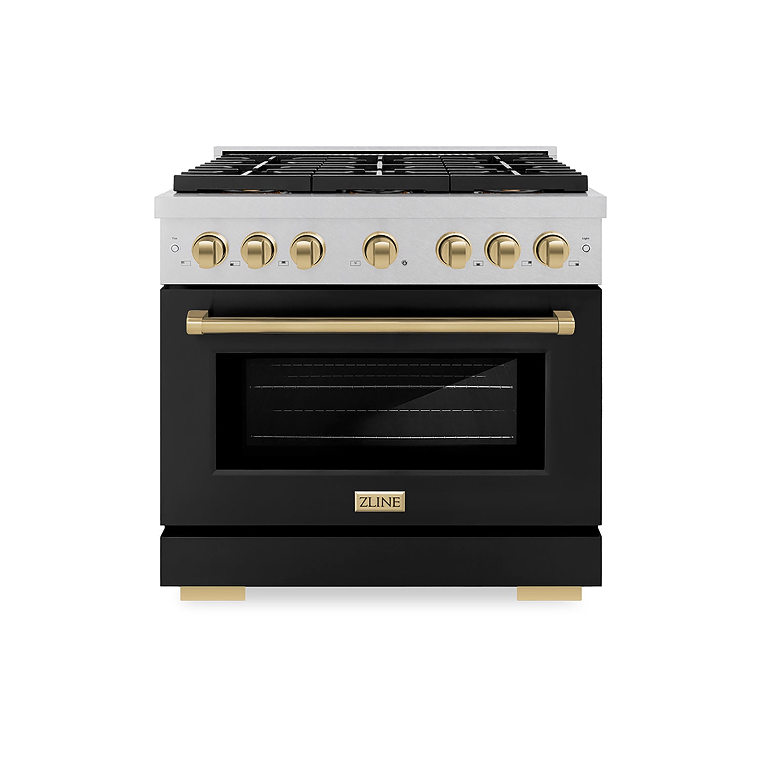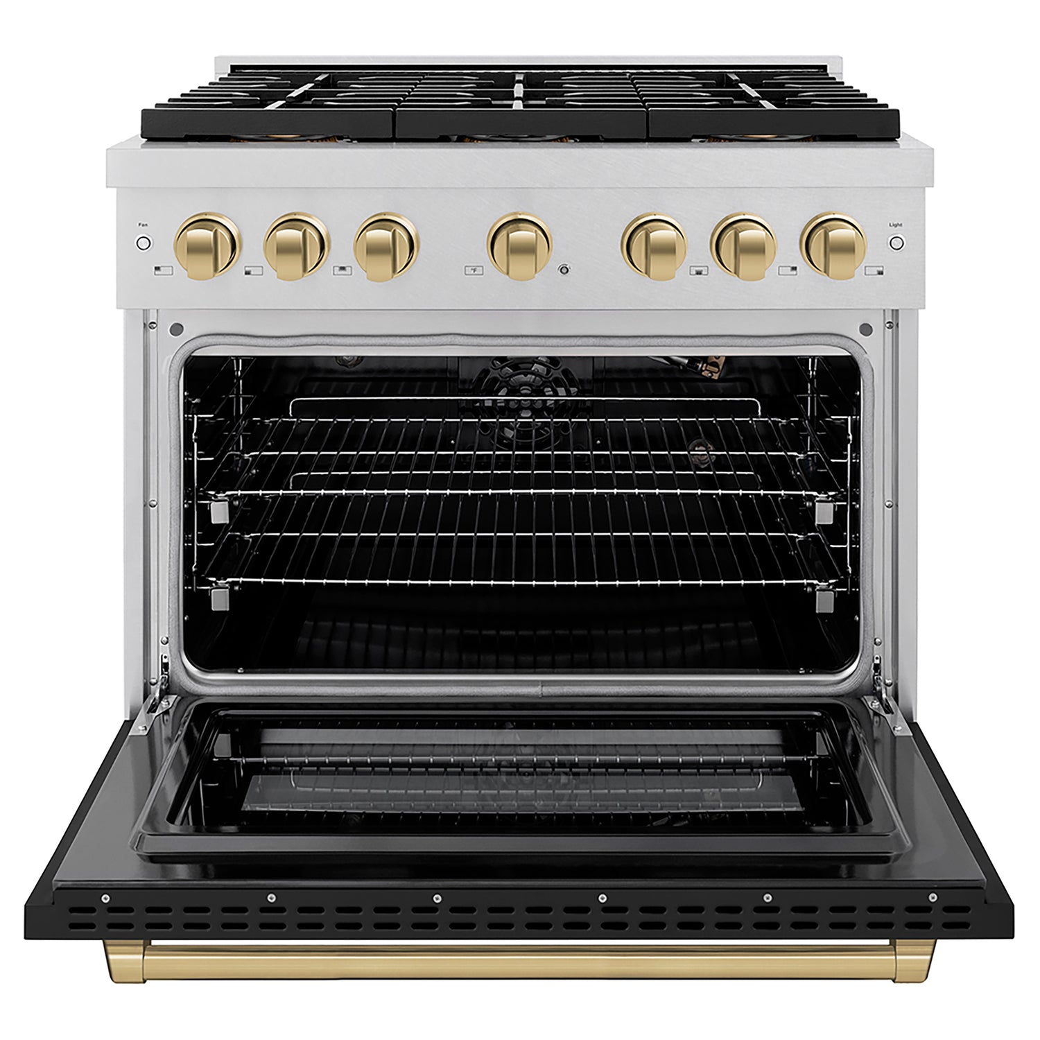 Luxury isn’t meant to be left desired—it’s meant to be attainable. The ZLINE Autograph Edition 36 in. 5.2 cu. ft. Paramount Gas Range with 6 Burner DuoPro™ Cooktop and Convection Gas Oven in Satin Stainless Steel with Black Matte Door and Champagne Bronze Accents (PSGRSZ-BLM36-CB) features a high-powered gas cooktop with 6 hand-crafted Italian dual-ring brass burners and a versatile gas convection oven allowing you to master every meal. Double your cooking power on every burner with a DuoPro™ Cooktop that delivers ultimate flame control flexibility and unprecedented culinary confidence.