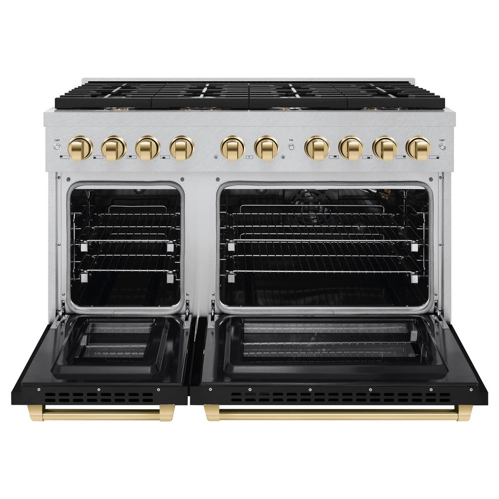 ZLINE Autograph 48" 6.7 cu. ft. Paramount Double Oven Dual Fuel Range with 8 Burner Gas Cooktop in Satin Stainless Steel with Black Matte Doors and Polished Gold Accents, SDRSZ-BLM-48-G