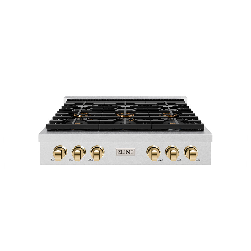 ZLINE Autograph 36" Paramount Gas Rangetop with 6 Burner DuoPro™ Cooktop in Satin Stainless Steel and Polished Gold Accents, PSRTSZ-36-G