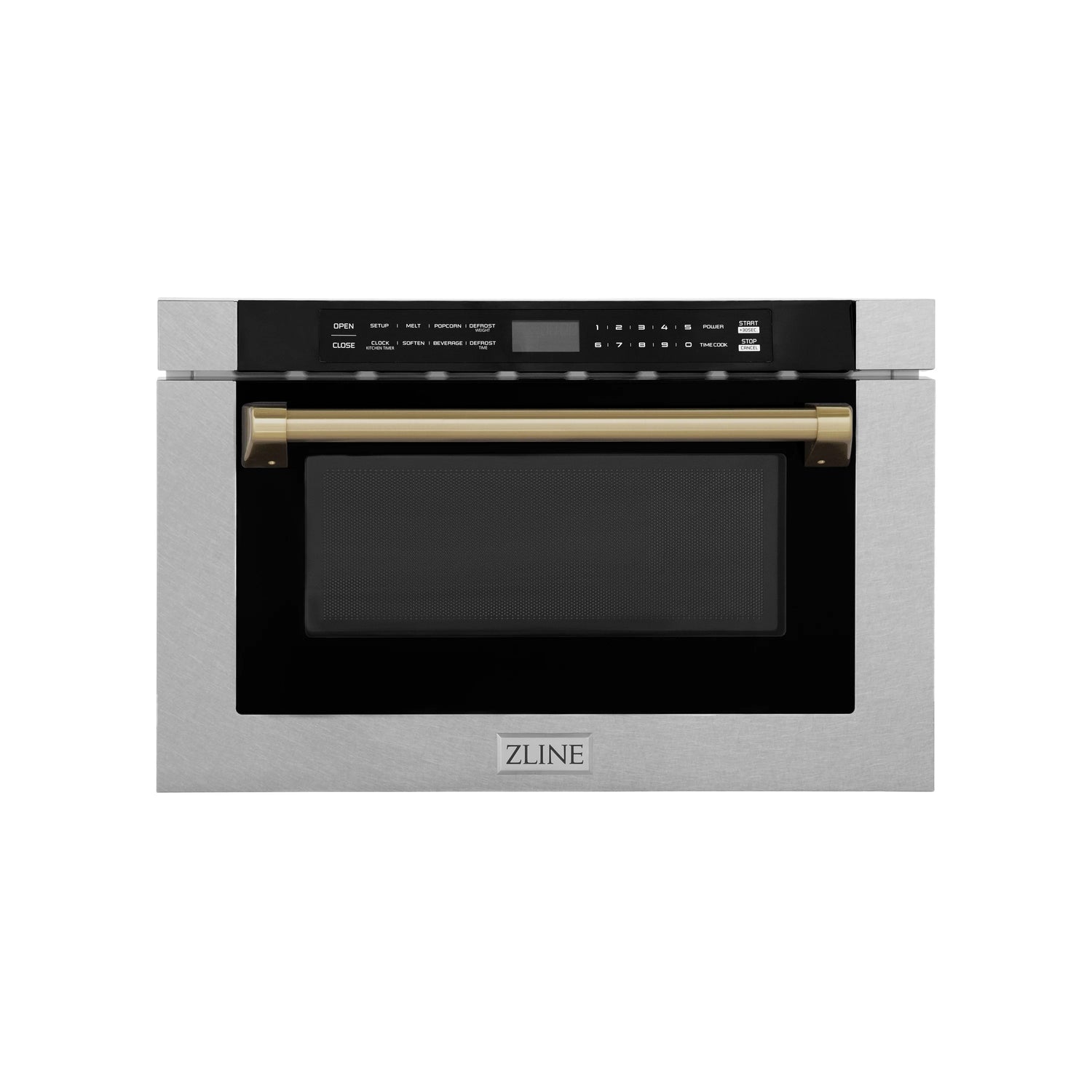 ZLINE Autograph 24" 1.2 cu. ft. Built-in Microwave Drawer with a Traditional Handle in Satin Stainless Steel and Champagne Bronze Accents, MWDZ-1-SS-H-CB