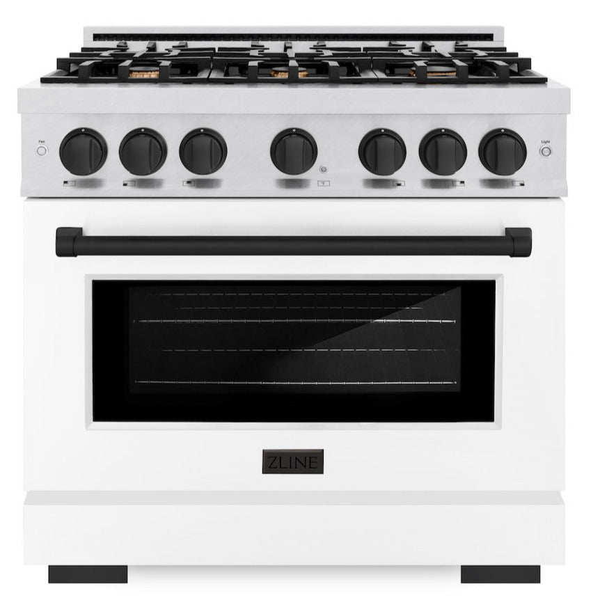ZLINE Autograph 36" 5.2 cu. ft. Select Dual Fuel Range with 6 Burner Gas Cooktop and Electric Convection Oven in Satin Stainless Steel with White Matte Door and Matte Black Accents, HDRSZ-WM-36-MB