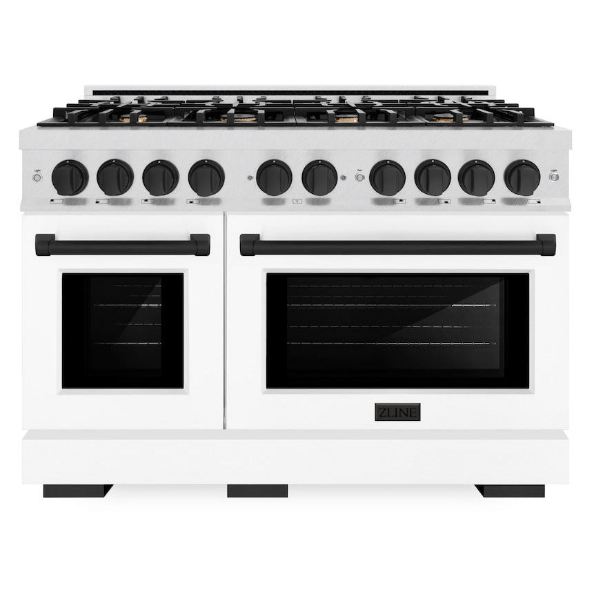 ZLINE Autograph 48" 6.7 cu. ft. Select Double Oven Dual Fuel Range with 8 Burner Gas Cooktop in Satin Stainless Steel with White Matte Doors and Matte Black Accents, HDRSZ-WM-48-MB
