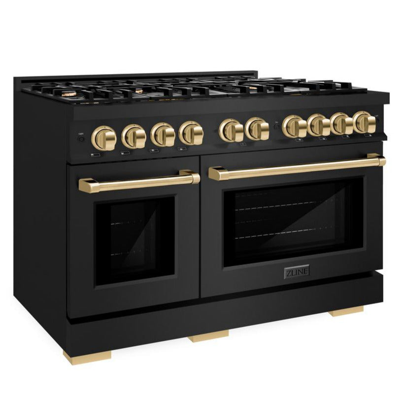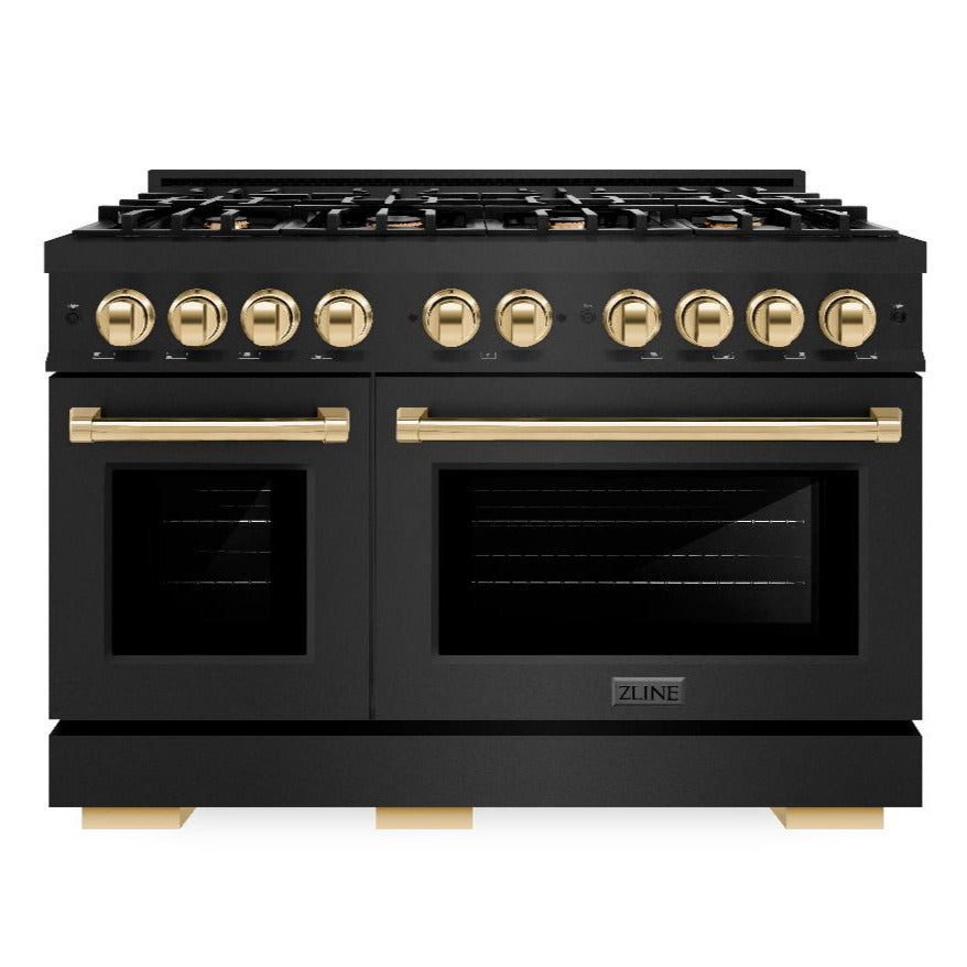 ZLINE Autograph 48" 6.7 cu. ft. Select Double Oven Gas Range with 8 Burners in Black Stainless Steel and Polished Gold Accents, HGRBZ-48-G