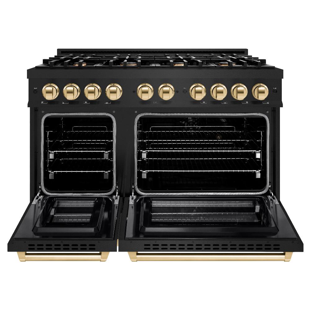 Luxury isn't meant to be desired - it's meant to be attainable. The ZLINE Autograph Edition 48 in. 6.7 cu. ft. Select Double Oven Gas Range with 8 Burner Cooktop in Black Stainless Steel and Polished Gold Accents (HGRBZ-48-G) combines the elegance of a hand-finished porcelain gas cooktop with 8 Italian-made auto-reignition burners, a large gas convection oven with an energy-efficient cooling fan to ensure quiet operation, a small baking oven, Horizon oven door window designs, and stunning polished gold knobs and handles allowing you to master every meal. With a modern, timeless style and refined functionality, ZLINE Select Gas Ranges are masterfully crafted to deliver an elevated culinary experience.