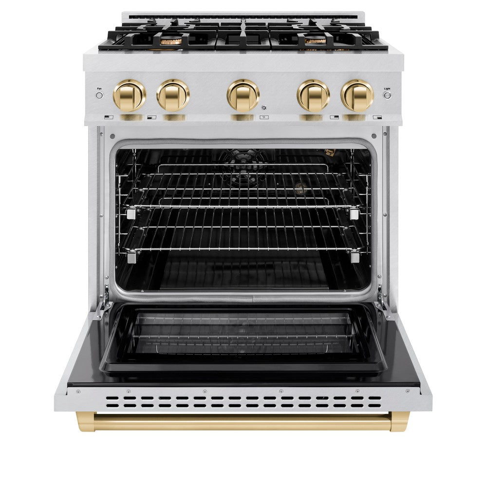 ZLINE Autograph 30" 4.2 cu. ft. Select Gas Range with 4 Burner Cooktop and Convection Gas Oven in Satin Stainless Steel and Polished Gold Accents, HGRSZ-30-G