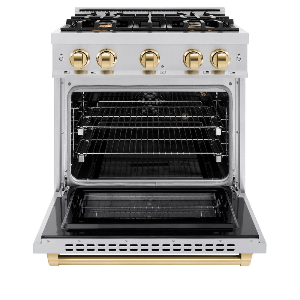 ZLINE Autograph 30" 4.2 cu. ft. Select Gas Range with 4 Burners in Stainless Steel and Polished Gold Accents, HGRZ-30-G