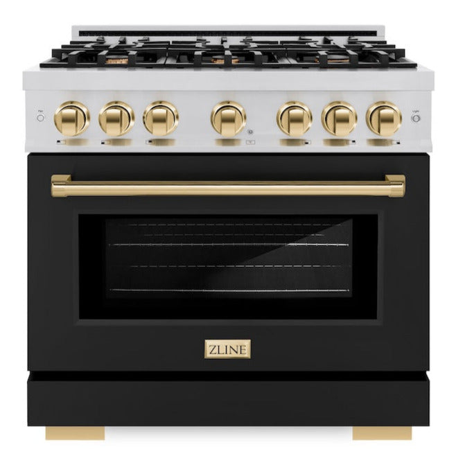 ZLINE Autograph 36" 5.2 cu. ft. Select Gas Range with 6 Burners in Stainless Steel with Black Matte Door and Polished Gold Accents, HGRZ-BLM-36-G