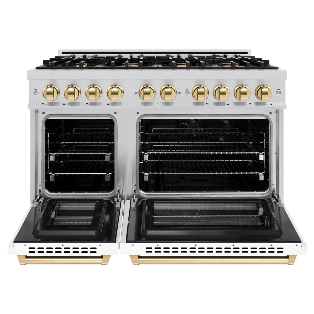 ZLINE Autograph 48" 6.7 cu. ft. Select Double Oven Dual Fuel Range with 8 Burner Gas Cooktop in Satin Stainless Steel with White Matte Doors and Polished Gold Accents, HDRSZ-WM-48-G