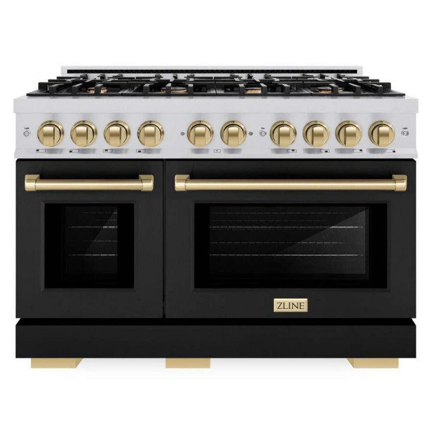 Luxury isn't meant to be desired - it's meant to be attainable. The ZLINE Autograph Edition 48 in. 6.7 cu. ft. Select Double Oven Dual Fuel Range with 8 Burner Gas Cooktop in Stainless Steel with Black Matte Doors and Champagne Bronze Accents (HDRZ-BLM-48-CB) combines the elegance of a hand-finished porcelain gas cooktop with 8 Italian-made auto-reignition burners, a large electric convection oven with an energy-efficient cooling fan to ensure quiet operation, a small bake-and-broil oven, beautiful black matte doors with Horizon window designs, and stunning champagne bronze knobs and handles allowing you to master every meal. With a modern, timeless style and refined functionality, ZLINE Select Dual Fuel Ranges are masterfully crafted to deliver an elevated culinary experience.