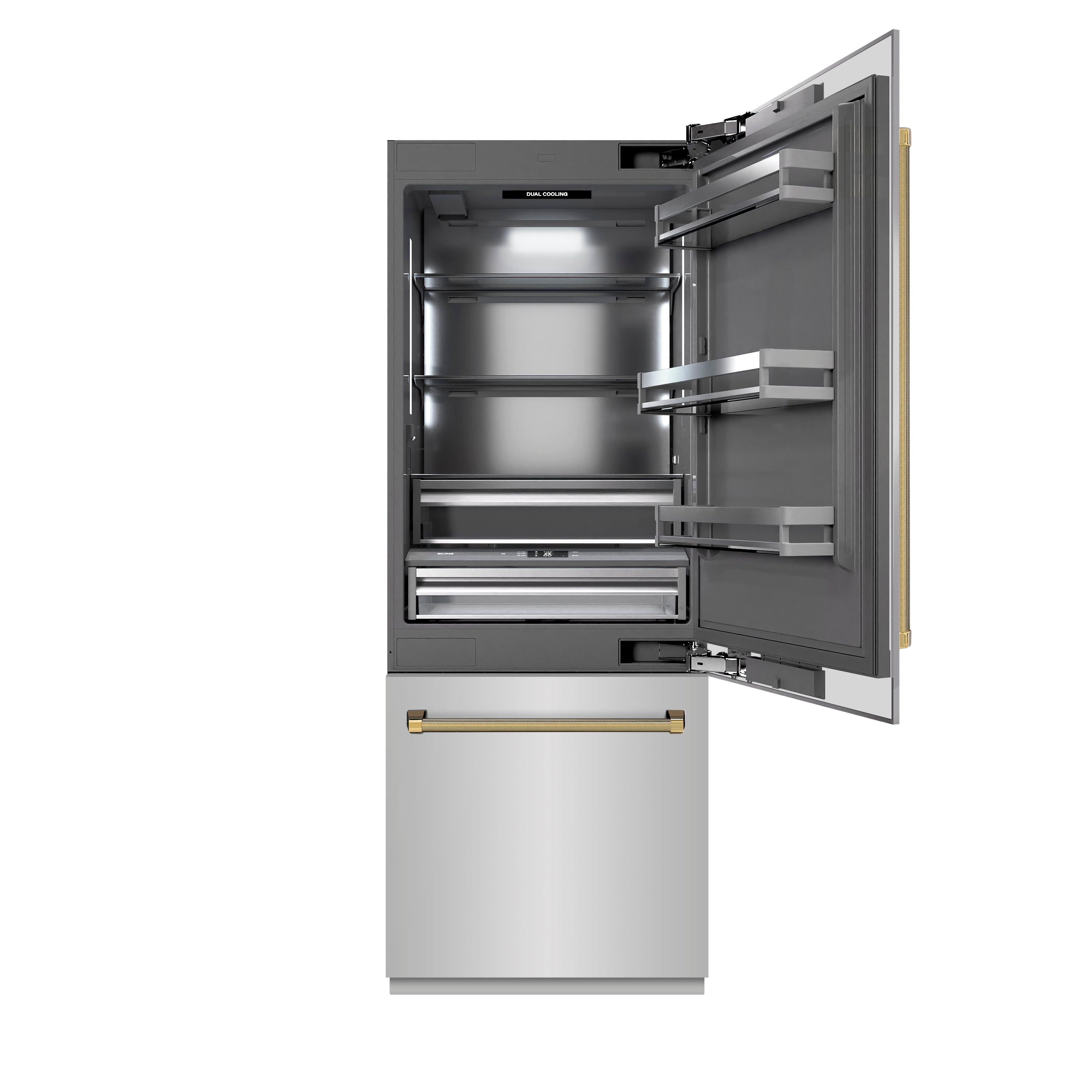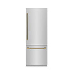 ZLINE Autograph 30" 16.1 cu. ft. Built-In Bottom Freezer Refrigerator with Water Dispenser and Ice Maker in Stainless Steel with Graphite Gray Interior and Polished Gold Helix Handles, GRBIVZ-30430KG