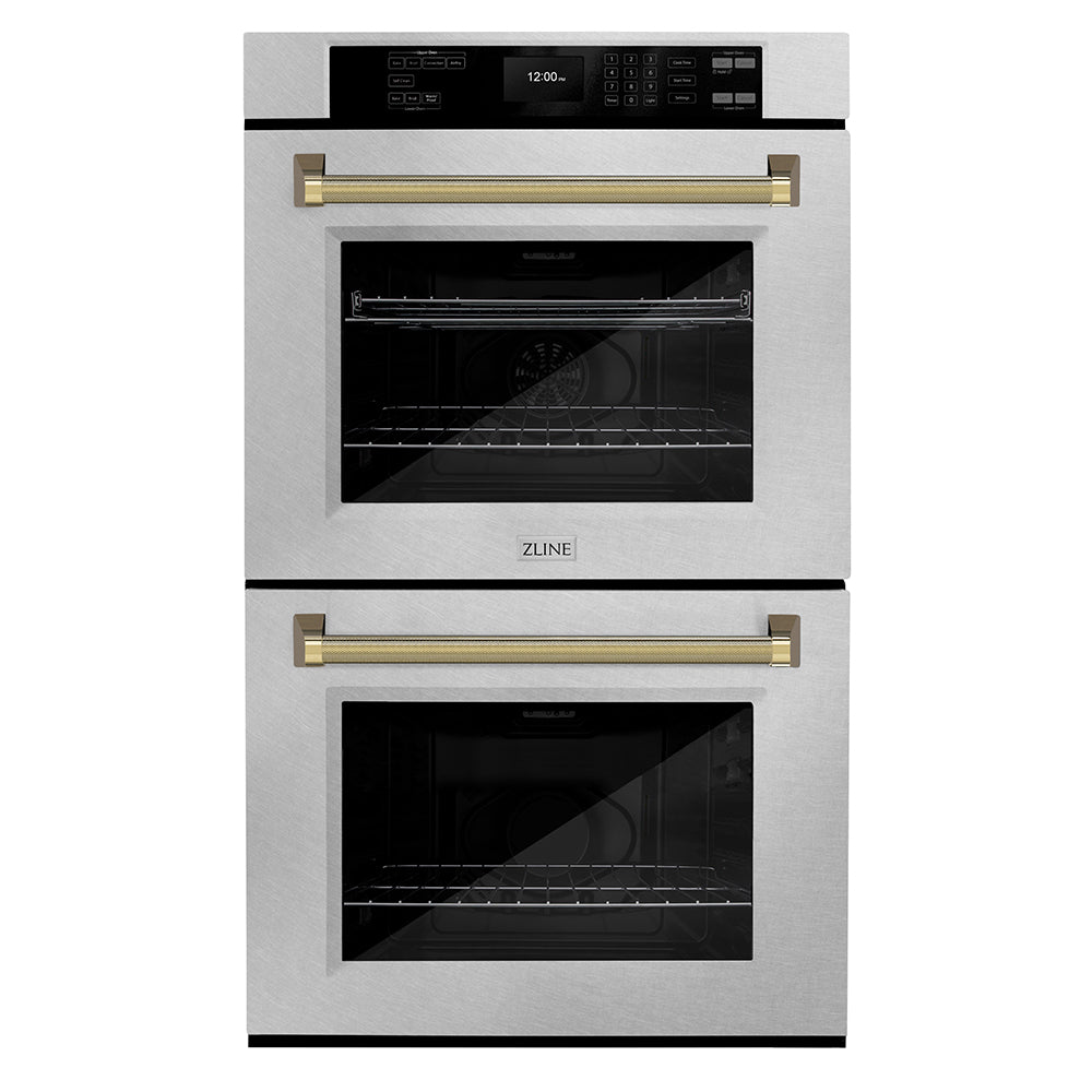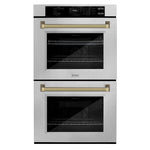 ZLINE Autograph 30" Professional True Convection Double Wall Oven with Air Fry and Self Clean in Satin Stainless Steel with Polished Gold Helix Handles, WADSZ-30-KG