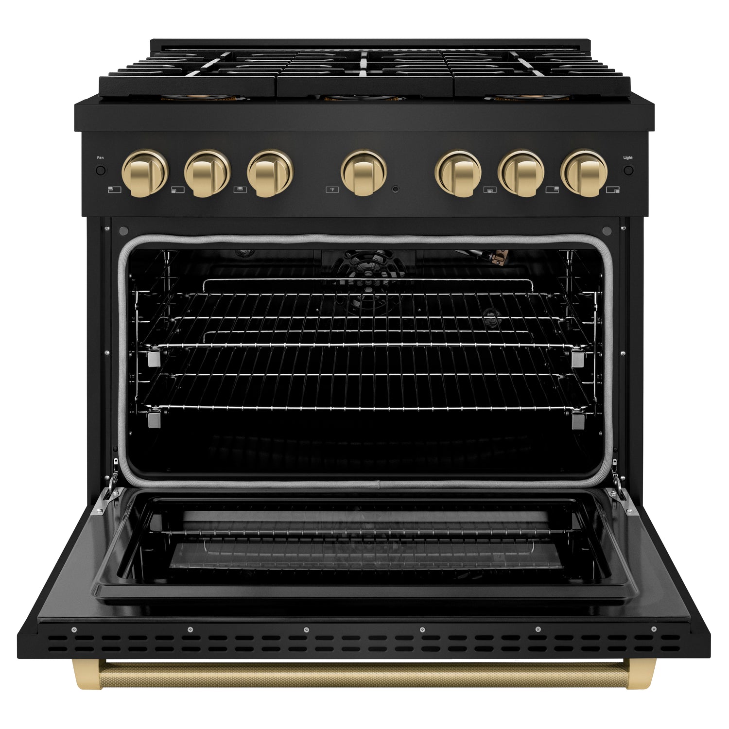 Luxury isn’t meant to be left desired—it’s meant to be attainable. The ZLINE Autograph Edition 36 in. 5.2 cu. ft. Paramount Gas Range with 6 Burner DuoPro™ Cooktop and Convection Gas Oven in Black Stainless Steel with Champagne Bronze Helix Handle and Accents (PSGRBZ-36-KCB) features a high-powered gas cooktop with 6 hand-crafted Italian dual-ring brass burners and a versatile gas convection oven allowing you to master every meal. With ZLINE DuoPro™, every burner brings the performance you need—wherever you need it.