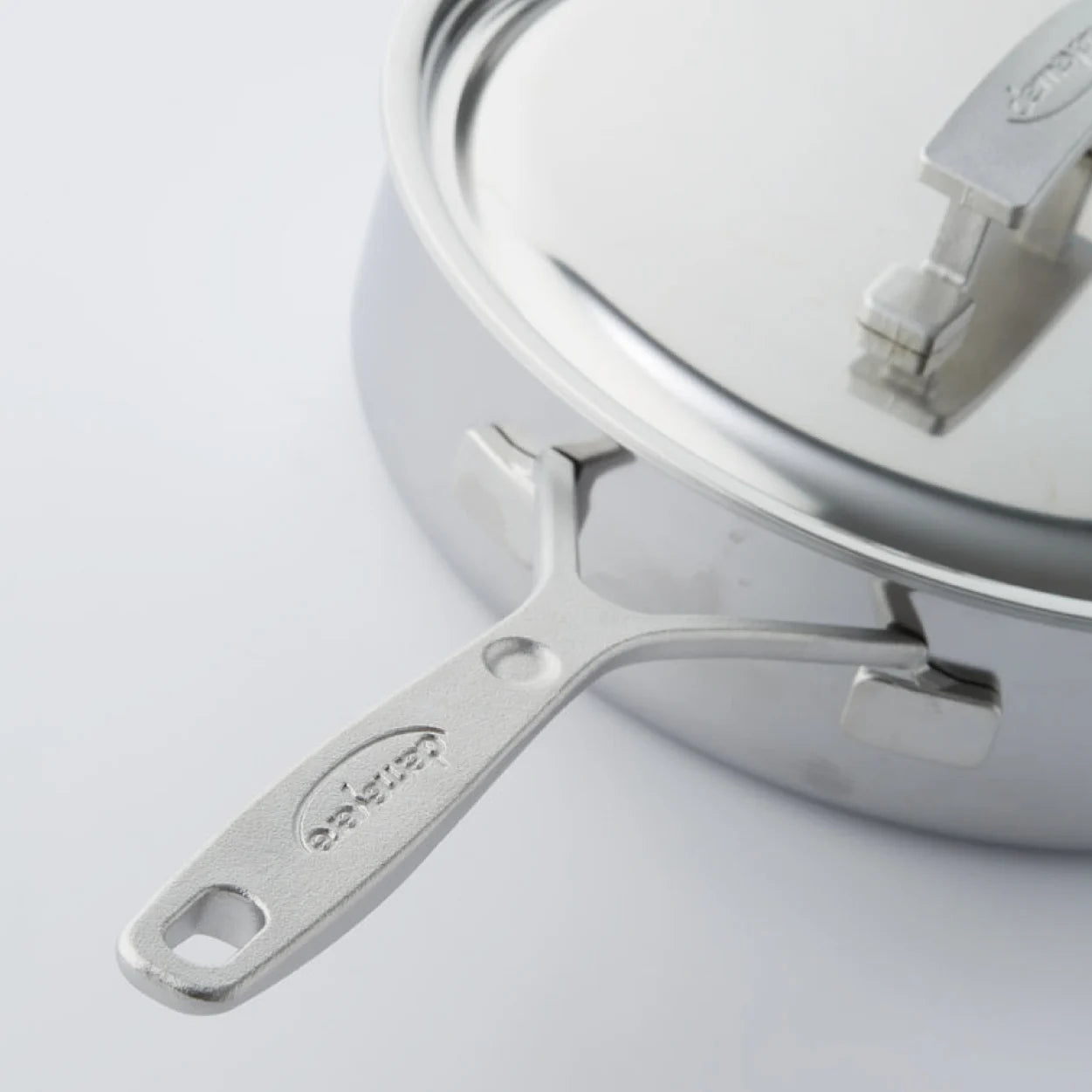 • Exceptional Design and Functionality. DEMEYERE Industry boasts a robust 5-ply construction with a substantial aluminum core. Crafted for perfect browning, it provides superior heat retention and even heating. Signature flat base technology guarantees compatibility with all stovetops, including induction, while eliminating hot spots
