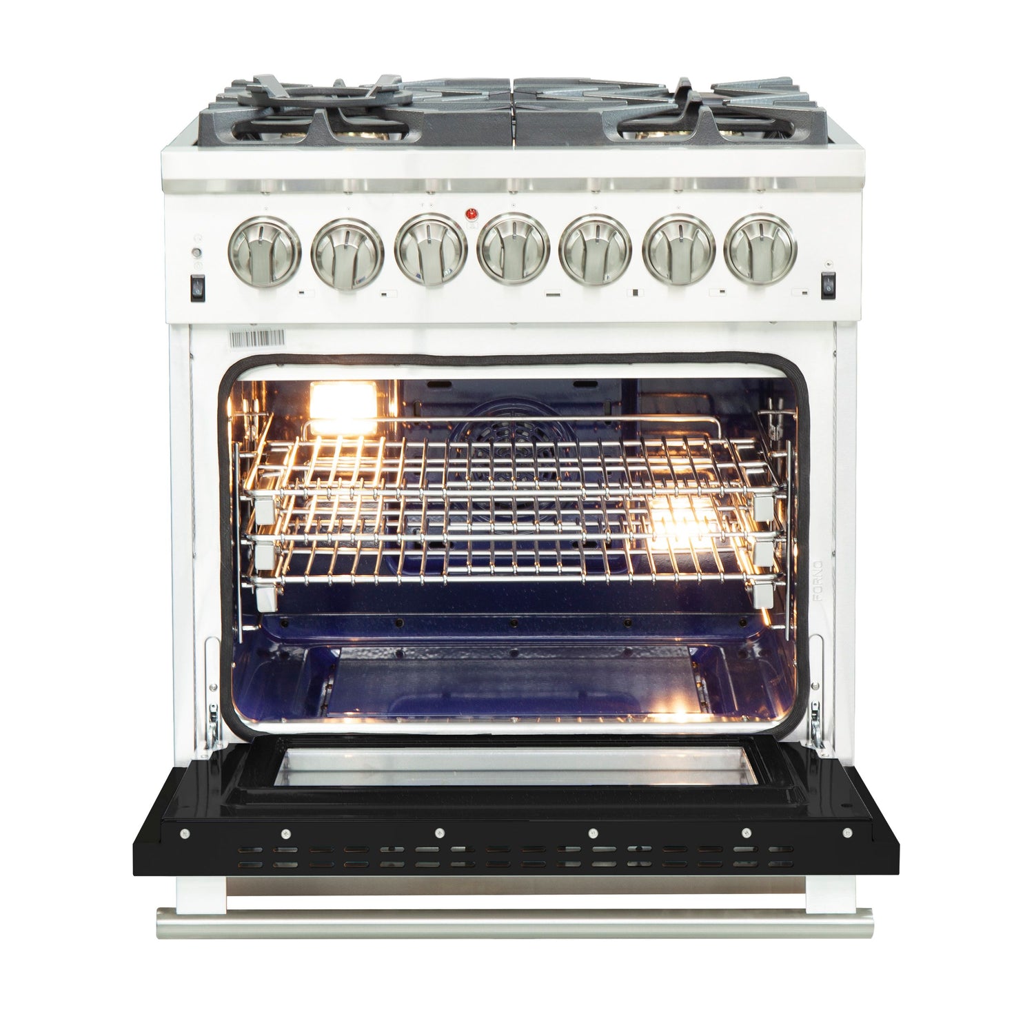 The Forno 30 Inch Capriasca Dual Fuel Range brings professional styling and performance into your home kitchen with its durable and beautiful 304-grade stainless steel design. The cooking surface includes 5 sealed dual-ring brass burners with a total output of 100,000 BTU. A powerful 20K dual-ring burner supports intense boiling or searing while maintaining control for gentle simmering, perfect for melting chocolate or preparing delicate sauces. Continuous heavy-duty cast-iron grates allow for easily sliding pots or pans off heat as needed. The spacious 4.32 cu. ft. true convection oven features an easy-to-clean blue enamel interior and a 3-layer glass door window that retains heat while offering a clear view inside. With a total oven output of 6,300 Watts, it provides ample power for baking, roasting, and broiling. Included are 3 fully telescopic stainless steel racks, a concave wok ring, and an LP conversion kit. Zinc-coated metal knobs with bezel rings complete the premium finish, built to last for years.