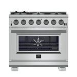 The Forno Capriasca 36 Inch Gas Range enhances your home kitchen with professional styling and performance through its durable and beautiful 304-grade stainless-steel design. The cooking surface features 6 sealed dual-ring brass burners, totaling 120,000 BTU. All burners, each at 20,000 BTU, can simmer precisely at 1,000 BTU. Continuous heavy-duty cast-iron grates facilitate easy sliding of pots or pans off heat over the enamel cooktop cavity, simplifying spill cleanup. The 5.36 cu. ft. gas oven, with a 30,000 BTU output and infrared red mesh broiler, enclosed in a blue enamel interior, offers optional convection for precise, and consistent cooking on multiple levels. For convenient viewing, a 3-layer glass oven door window is included. The package includes 3 telescopic stainless-steel oven racks, wok support, and an LP conversion kit. Additionally, zinc-coated illuminated metal knobs with bezel rings ensure enduring beauty.