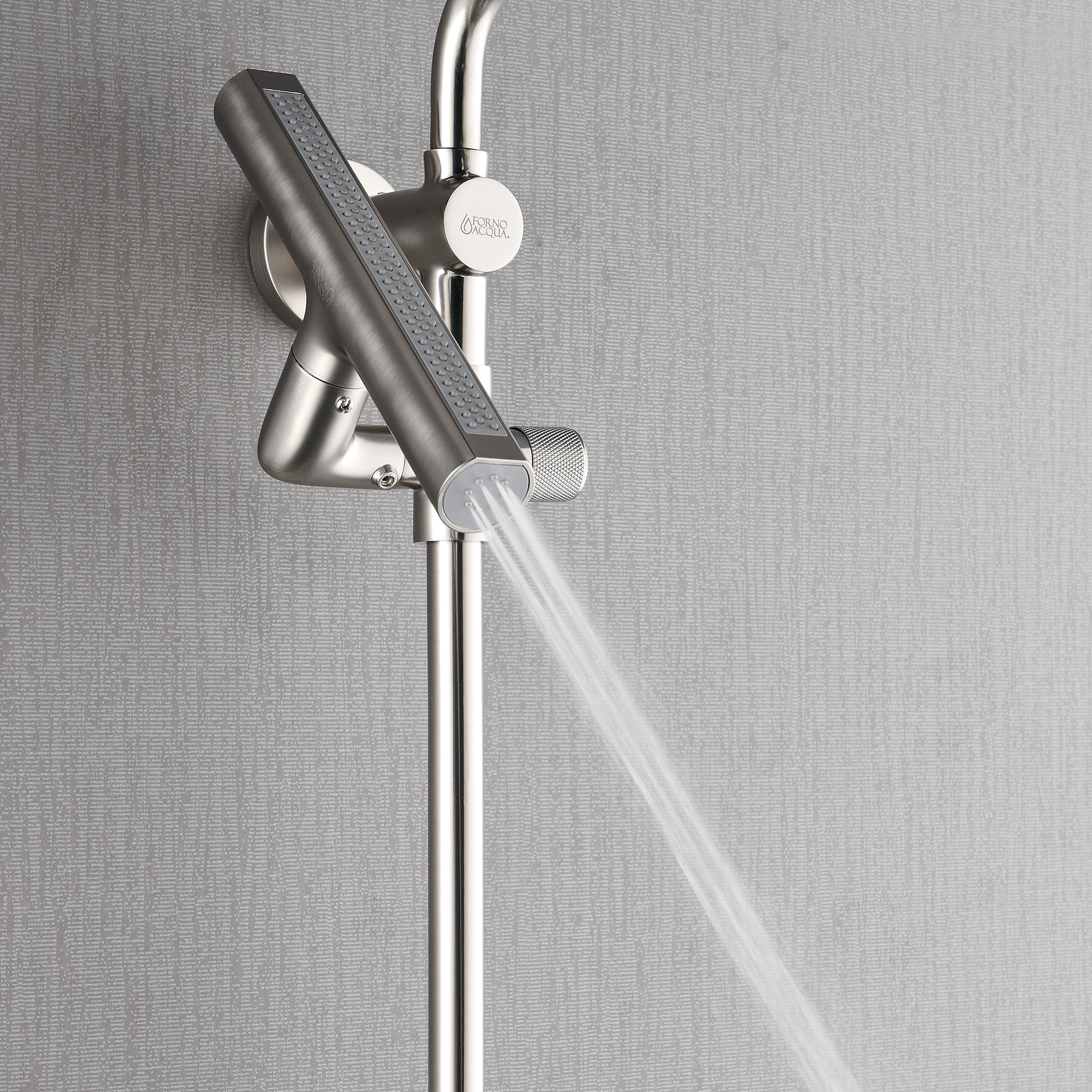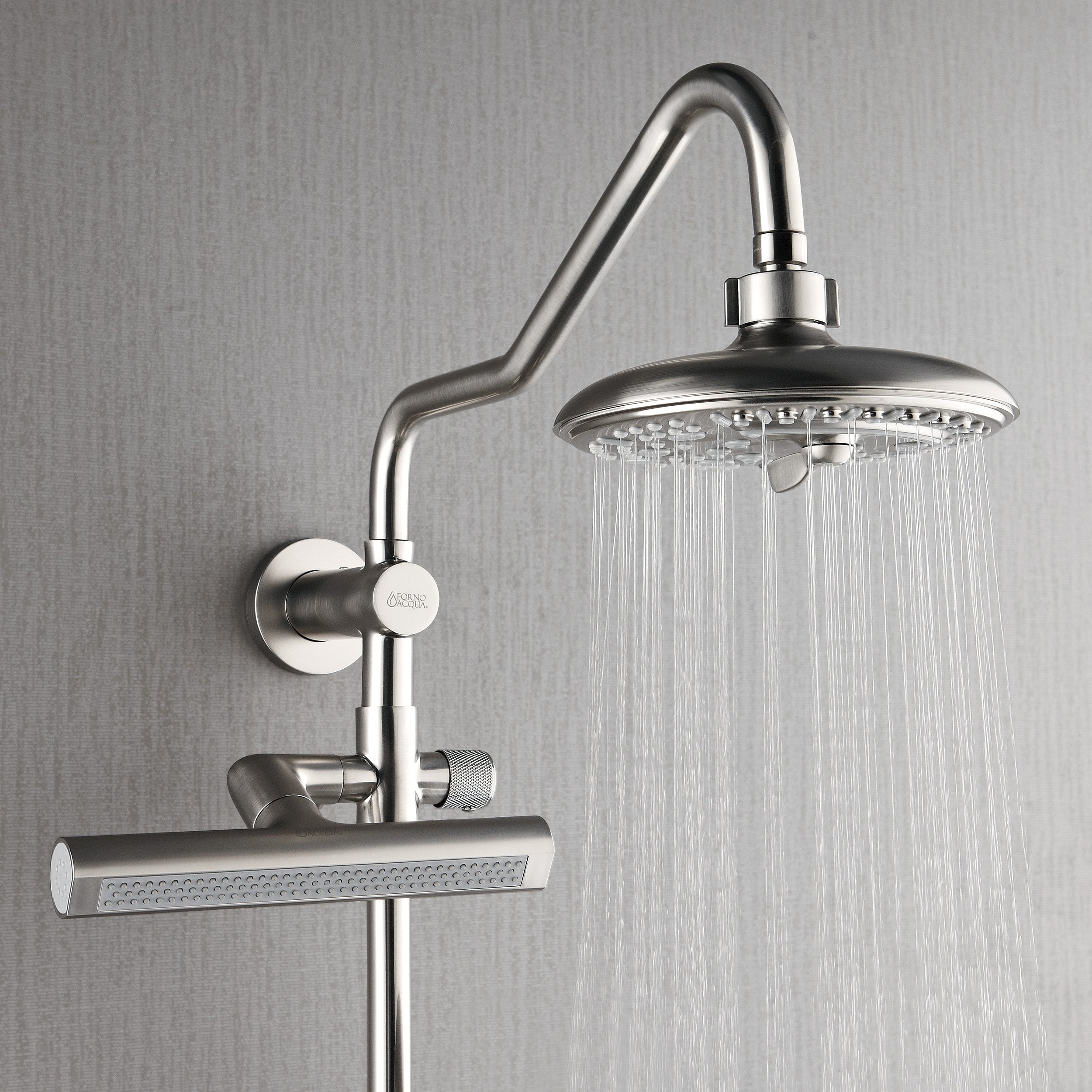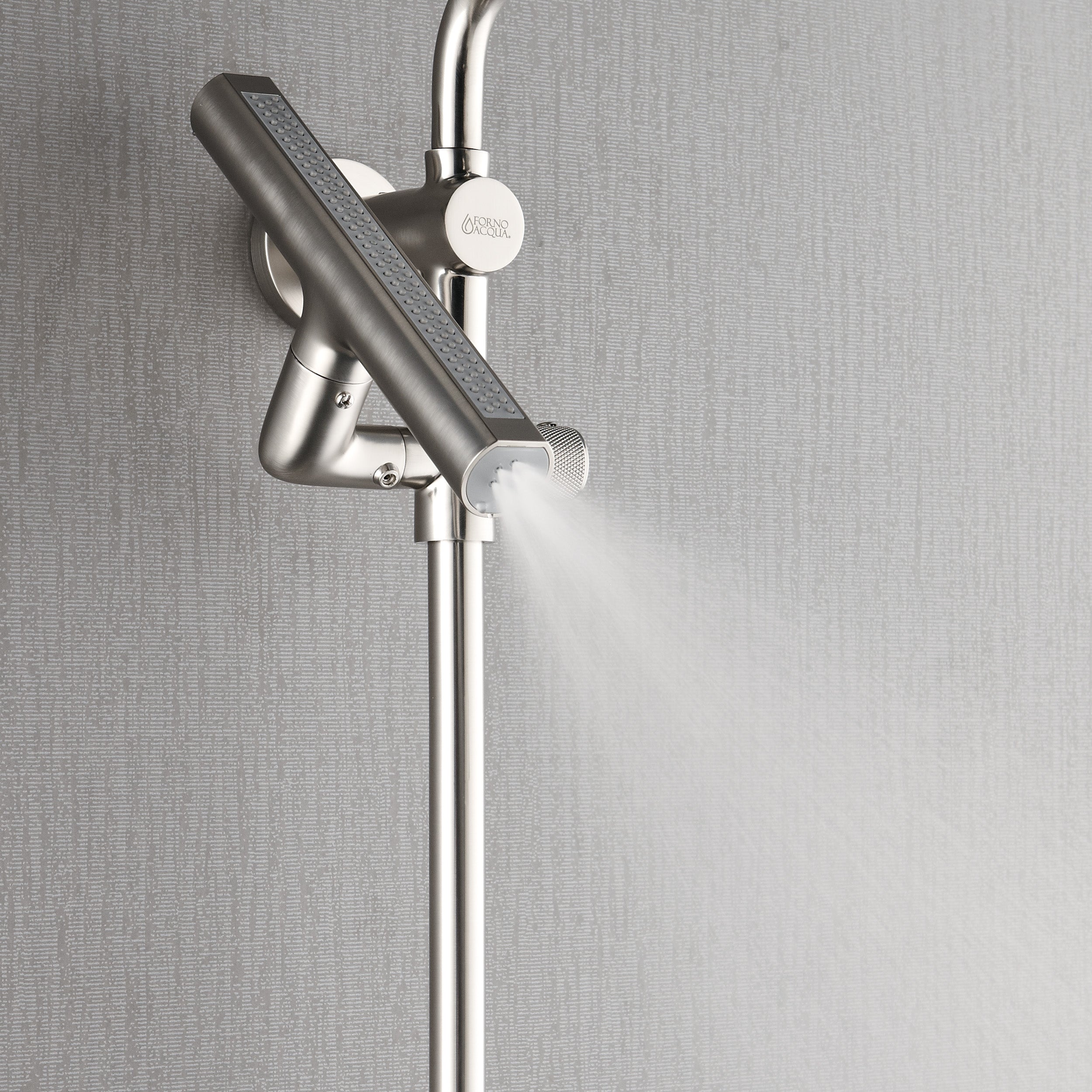 Transform your daily routine into a spa-like escape with the FORNO ACQUA AcquaSPA Shower Column with AcquaFALL, where performance meets Italian-inspired design. This 3-in-1 wall-mounted system features a U.S.-patented 8" rain shower head with six customizable spray modes, from gentle mist to revitalizing massage. At the heart of the experience is the AcquaFALL Waterfall Jet, a 10-1/2" adjustable feature that delivers wide, soothing coverage or focused relief—perfect for melting away stress and refreshing sore muscles. A 5-function ergonomic handheld with a height-adjustable sliding bar ensures flexibility and comfort for every user. Built for easy DIY installation with standard U.S. plumbing, the AcquaSPA System blends high-performance comfort and timeless elegance for modern and transitional bathrooms alike.