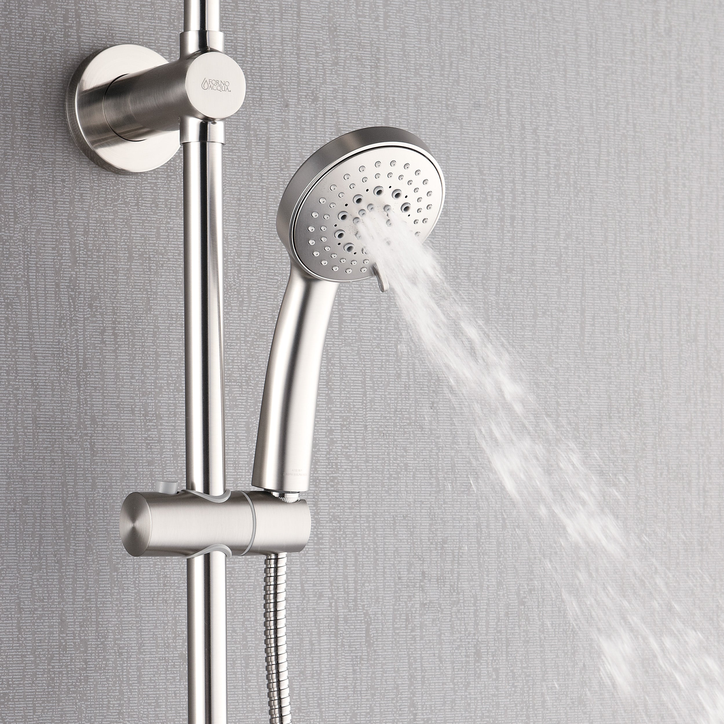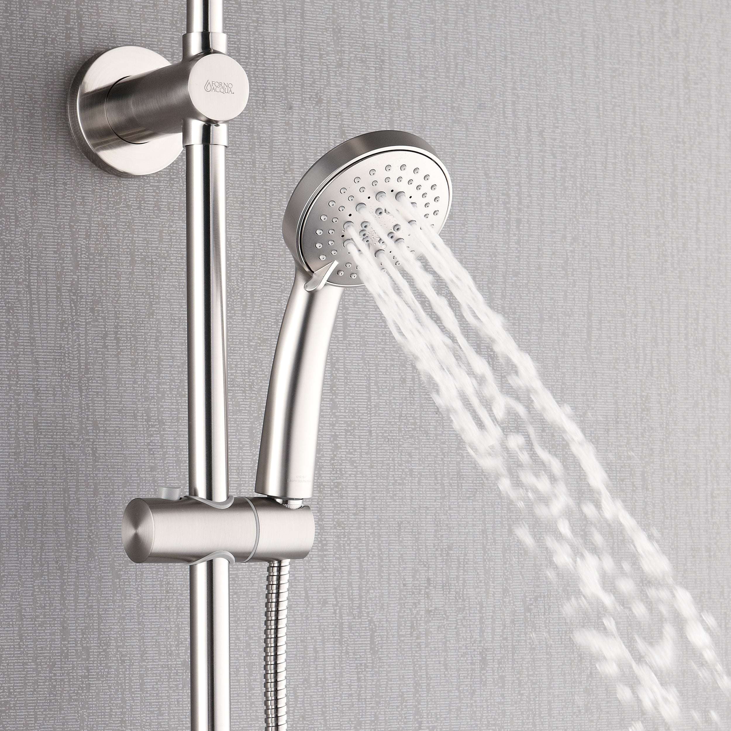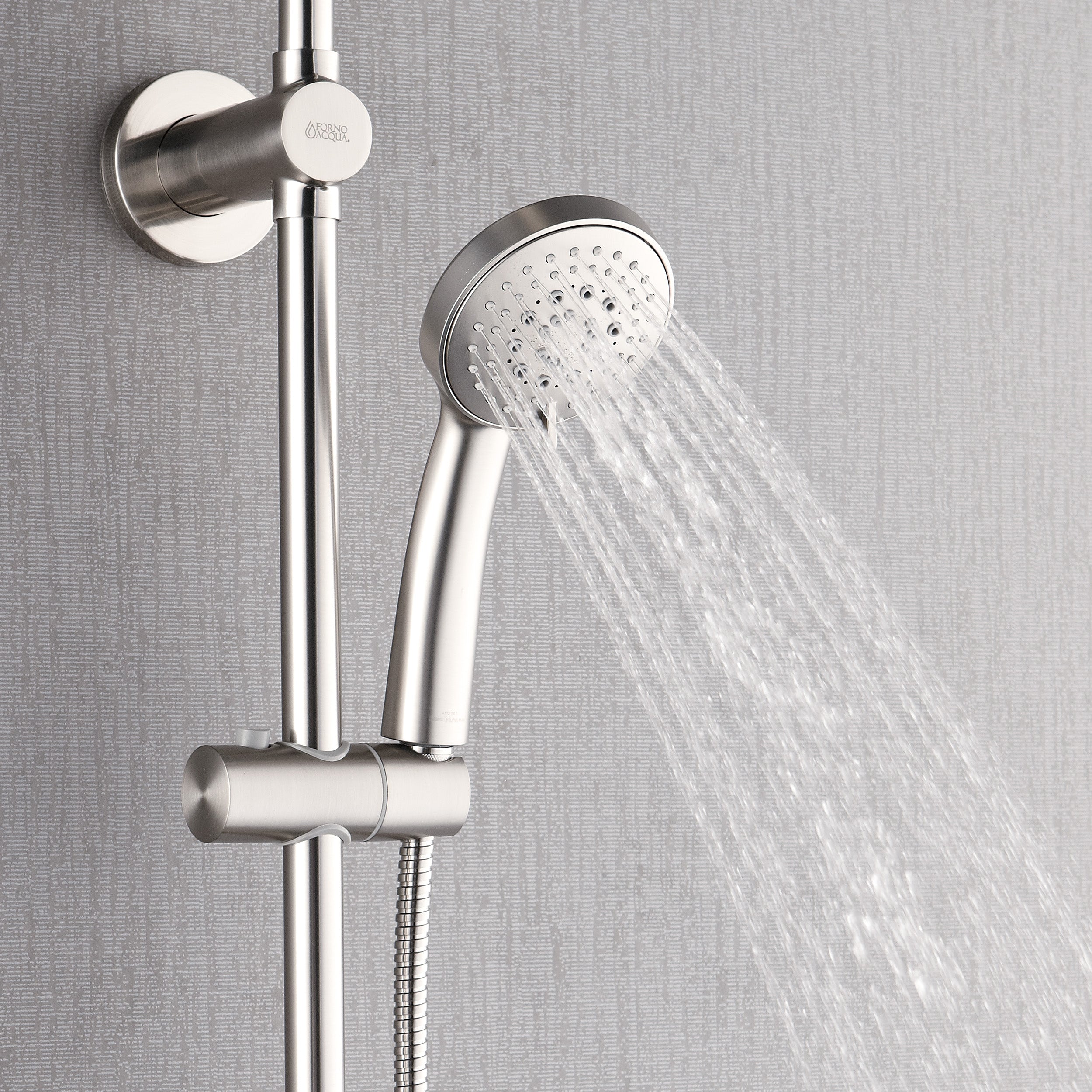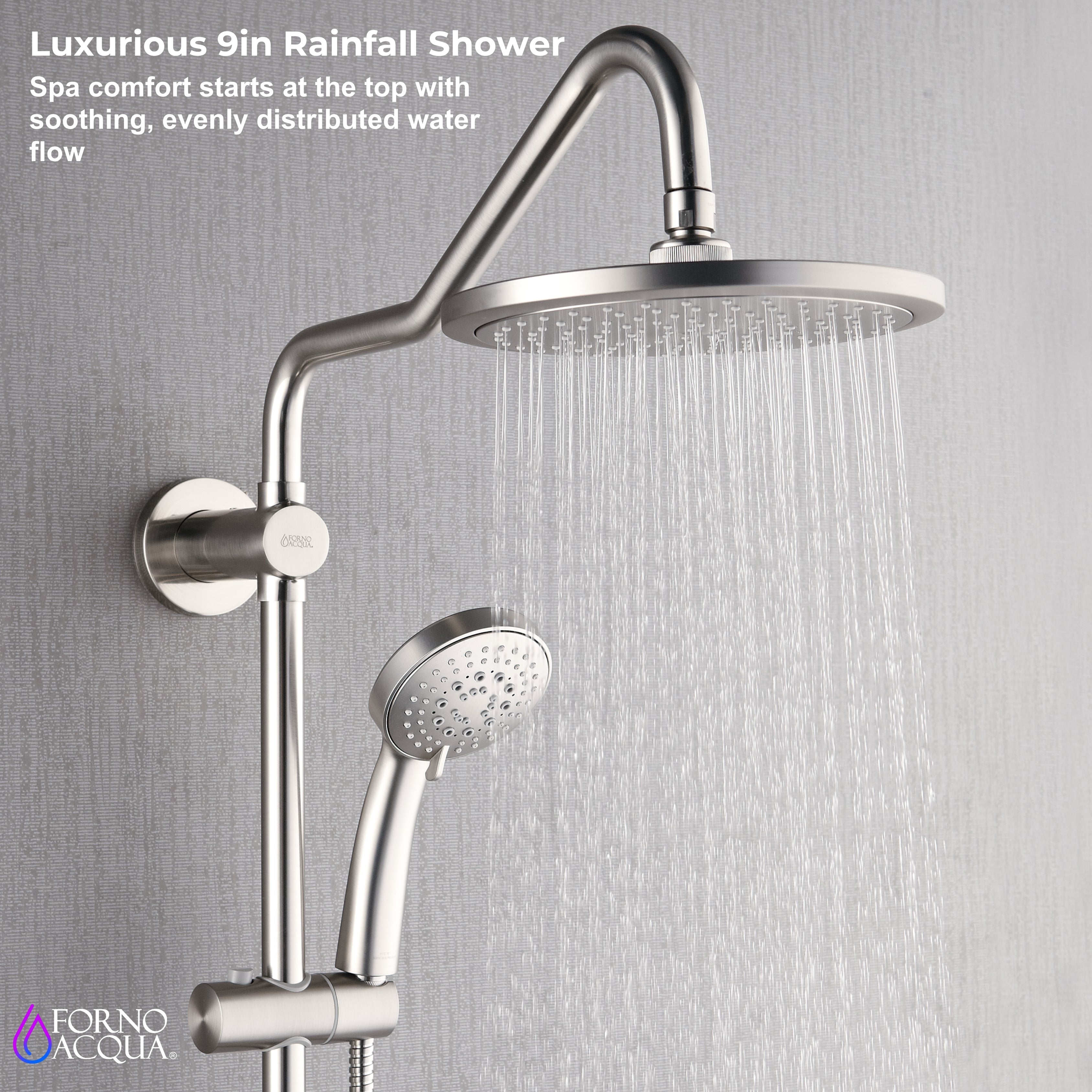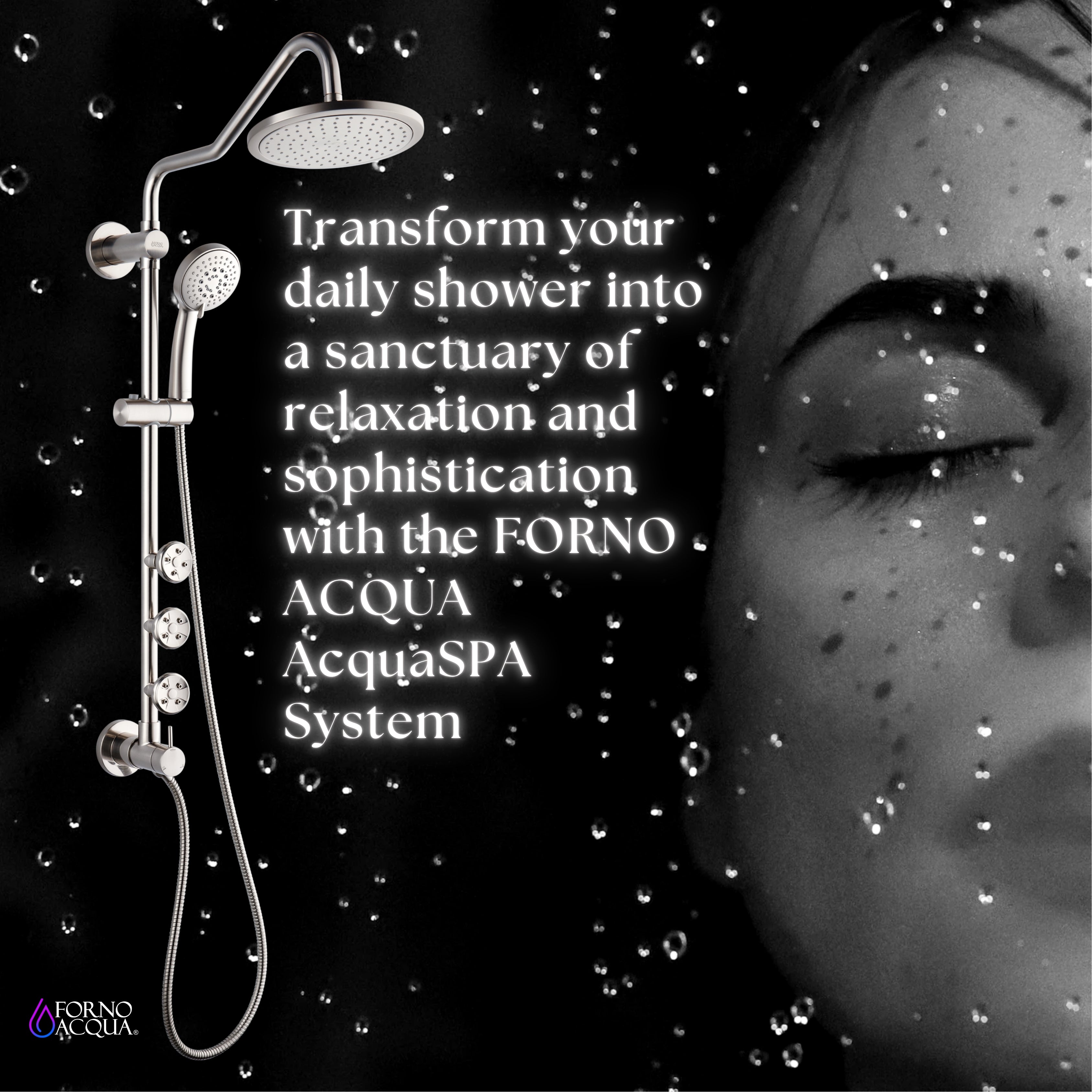 Refresh your bathroom with the FORNO ACQUA AcquaSPA Shower Column, a spa-style upgrade designed for modern living. This system features a soothing 9" oversized rain shower head for immersive full-body coverage, three adjustable body jets for targeted muscle relief, and a 5-function ergonomic handheld for flexible use. Finished in brushed stainless steel, it delivers lasting durability and sleek style. With a water-efficient 1.8 GPM or 2.5 GPM flow rate, it maintains strong, consistent pressure while meeting EPA standards. The smooth 6-way diverter provides effortless control of all outlets, and the DIY-friendly design installs quickly on flat or uneven walls using existing plumbing—no remodeling required.