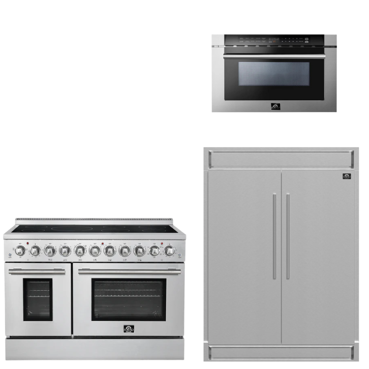 FORNO Appliance Package - 48" Electric Range, 60" Refrigerator and 24" Microwave Drawer