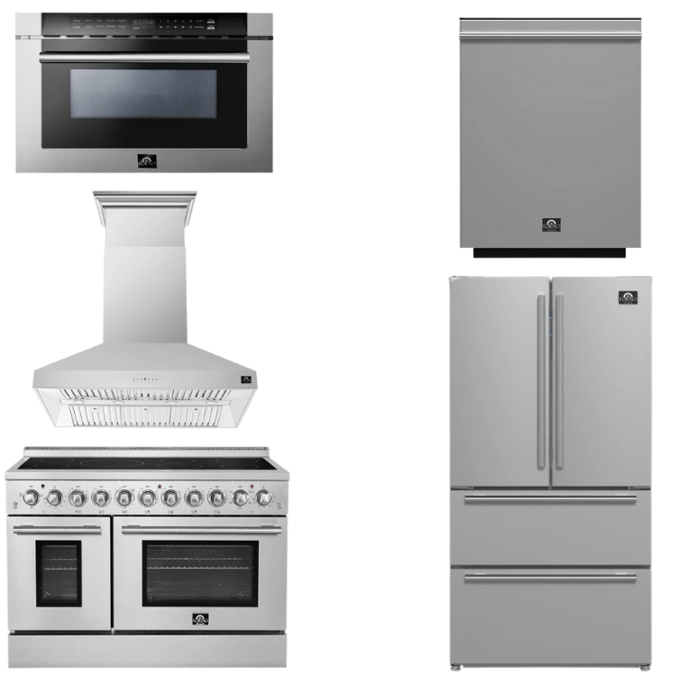 FORNO Appliance Package - 48" Electric Range, Range Hood, 36" Refrigerator, Dishwasher, 24" Microwave Drawer