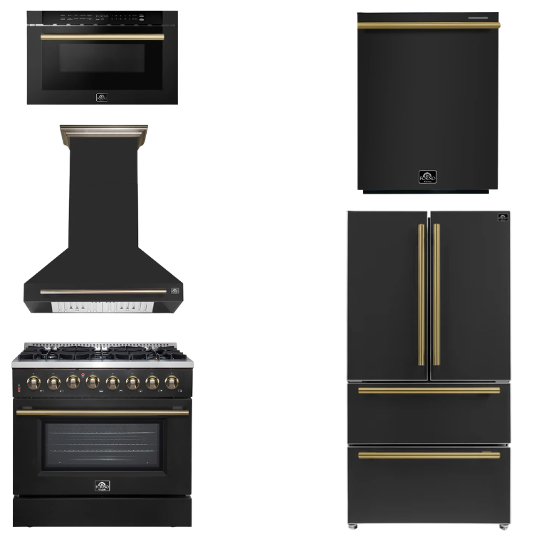 FORNO Appliance Package - 36" Dual Fuel Range, Range Hood, 36" Refrigerator, Dishwasher, Microwave in Black with Antique Brass Accents