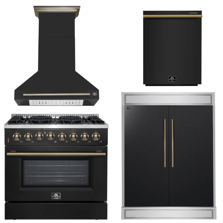 FORNO Appliance Package - 36" Dual Fuel Range, Range Hood, 60" Refrigerator, Dishwasher in Black with Antique Brass Accents