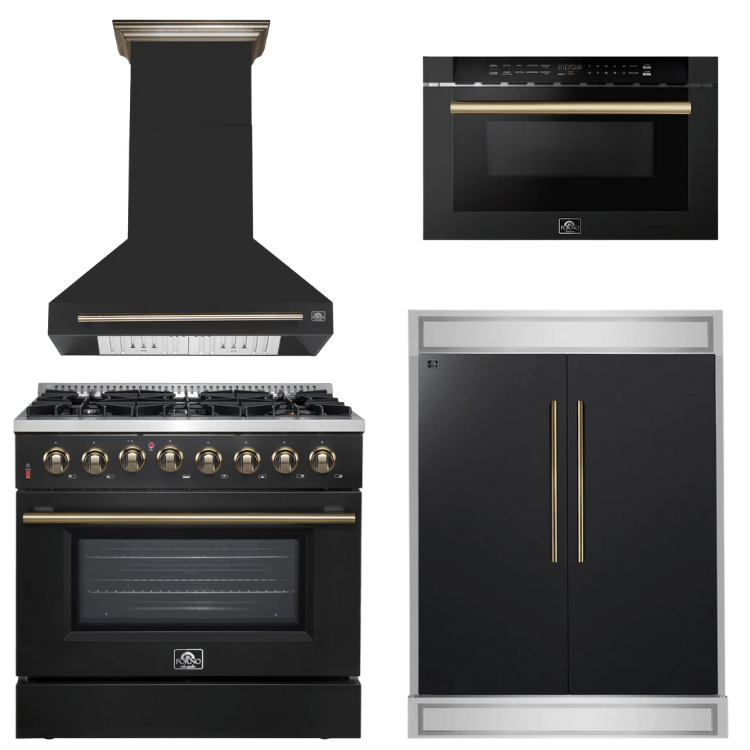 FORNO Appliance Package - 36" Dual Fuel Range, Range Hood, 60" Refrigerator, Microwave in Black with Antique Brass Accents