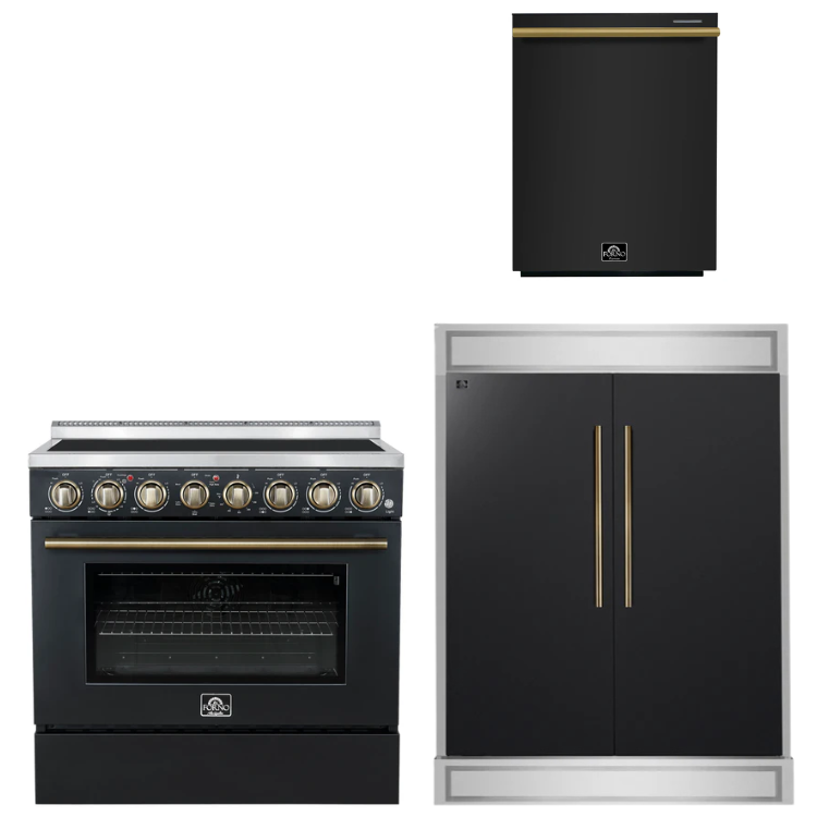 FORNO Appliance Package - 36" Electric Range, 60" Refrigerator, Dishwasher in Black with Antique Brass Accents