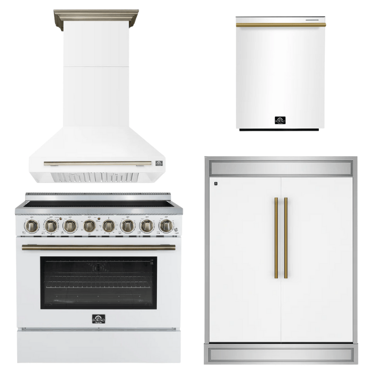 FORNO Appliance Package - 36" Electric Range, Range Hood, 60" Refrigerator, Dishwasher in White with Antique Brass Accents