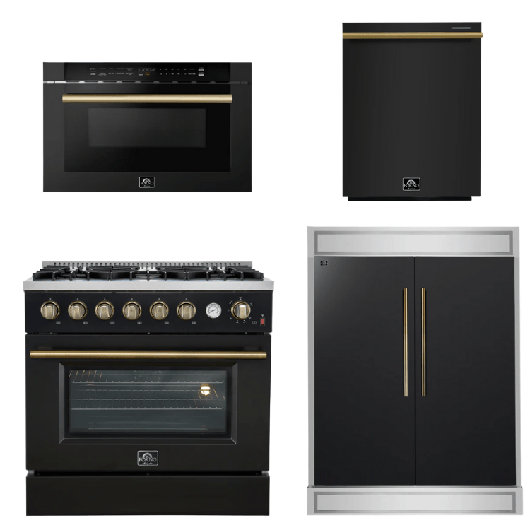 FORNO Appliance Package - 36" Gas Range, 60" Refrigerator, Dishwasher, Microwave in Black with Antique Brass Accents