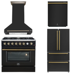 FORNO Appliance Package - 36" Gas Range, Range Hood, 36" Refrigerator, Dishwasher in Black with Antique Brass Accents