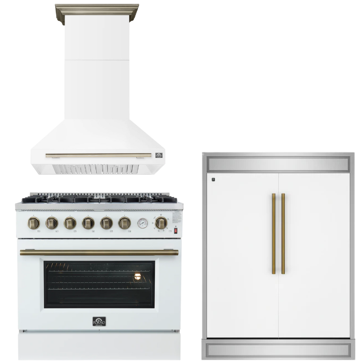 FORNO Appliance Package - 36" Gas Range, Range Hood, 60" Refrigerator in White with Antique Brass Accents