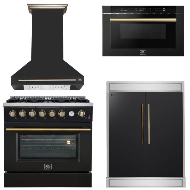 FORNO Appliance Package - 36" Gas Range, Range Hood, 60" Refrigerator, Microwave in Black with Antique Brass Accents