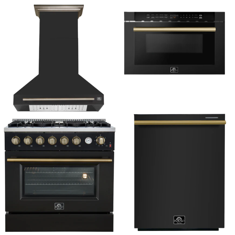 FORNO Appliance Package - 36" Gas Range, Range Hood, Dishwasher, Microwave in Black with Antique Brass Accents