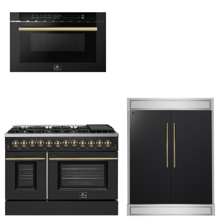 FORNO Appliance Package - 48" Dual Fuel Range, 60" Refrigerator, Microwave in Black with Antique Brass Accents