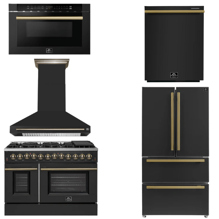 FORNO Appliance Package - 48" Dual Fuel Range, Range Hood, 36" Refrigerator, Dishwasher, Microwave in Black with Antique Brass Accents