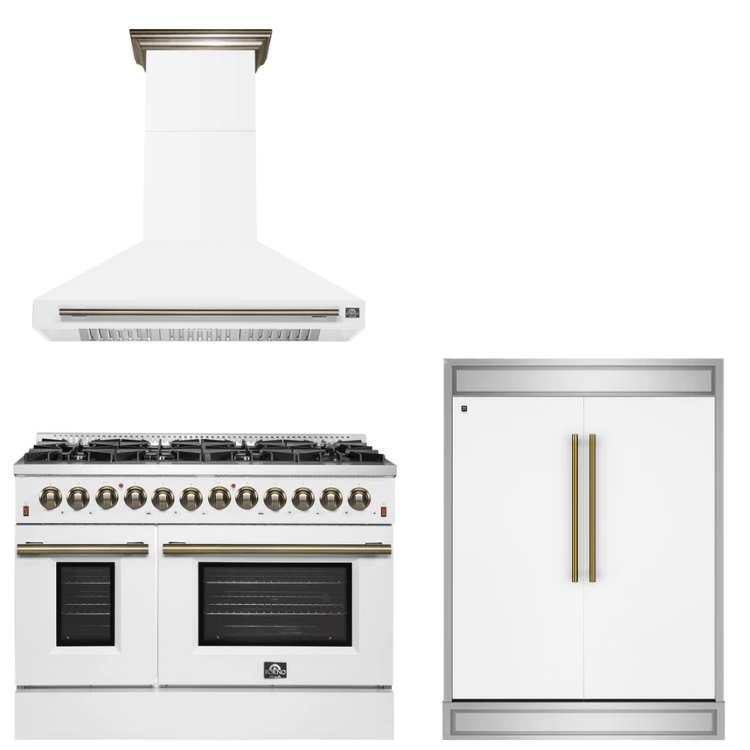 FORNO Appliance Package - 48" Dual Fuel Range, Range Hood, 60" Refrigerator in White with Antique Brass Accents
