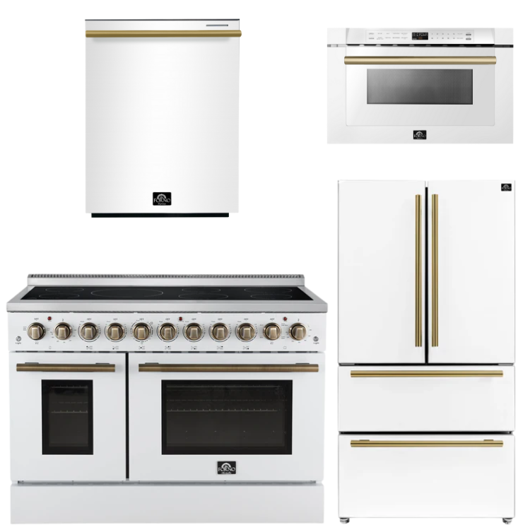 FORNO Appliance Package - 48" Electric Range, 36" Refrigerator, Dishwasher, Microwave in White with Antique Brass Accents