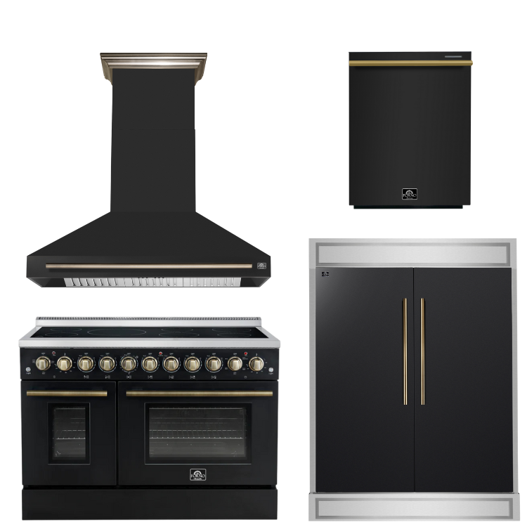 FORNO Appliance Package - 48" Electric Range, Range Hood, 60" Refrigerator, Dishwasher in Black with Antique Brass Accents