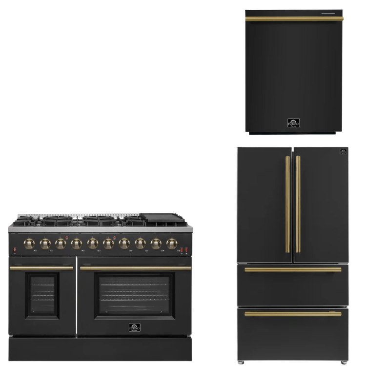 FORNO Appliance Package - 48" Gas Range, 36" Refrigerator, Dishwasher in Black with Antique Brass Accents