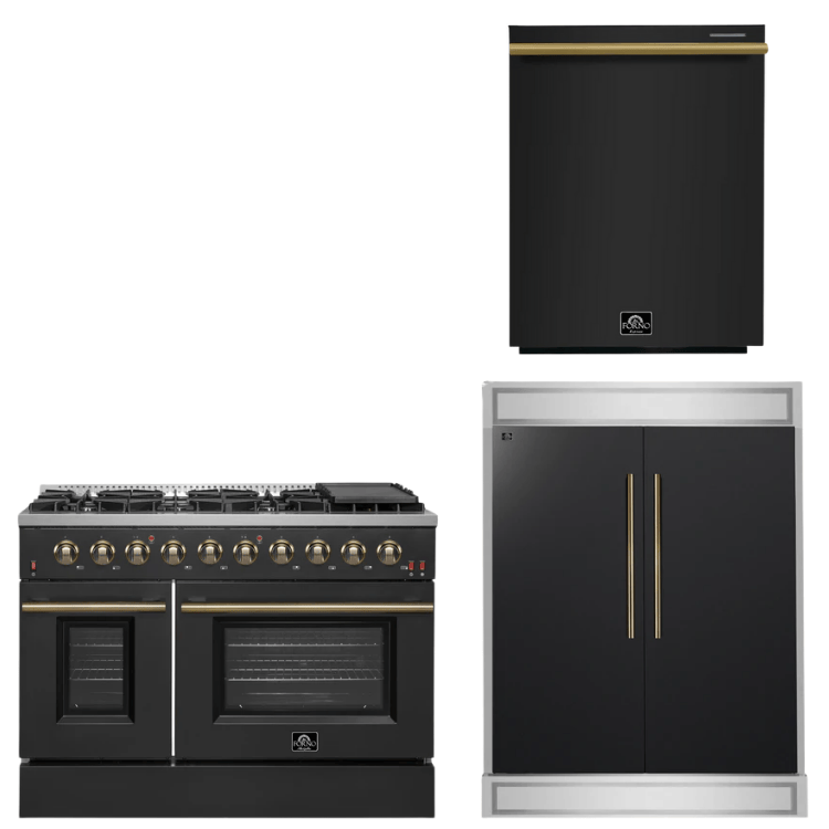 FORNO Appliance Package - 48" Gas Range, 60" Refrigerator, Dishwasher in Black with Antique Brass Accents