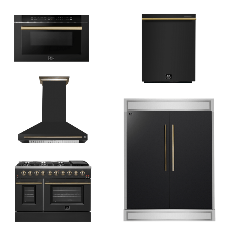 FORNO Appliance Package - 48" Gas Range, Range Hood, 60" Refrigerator, Dishwasher, Microwave in Black with Antique Brass Accents