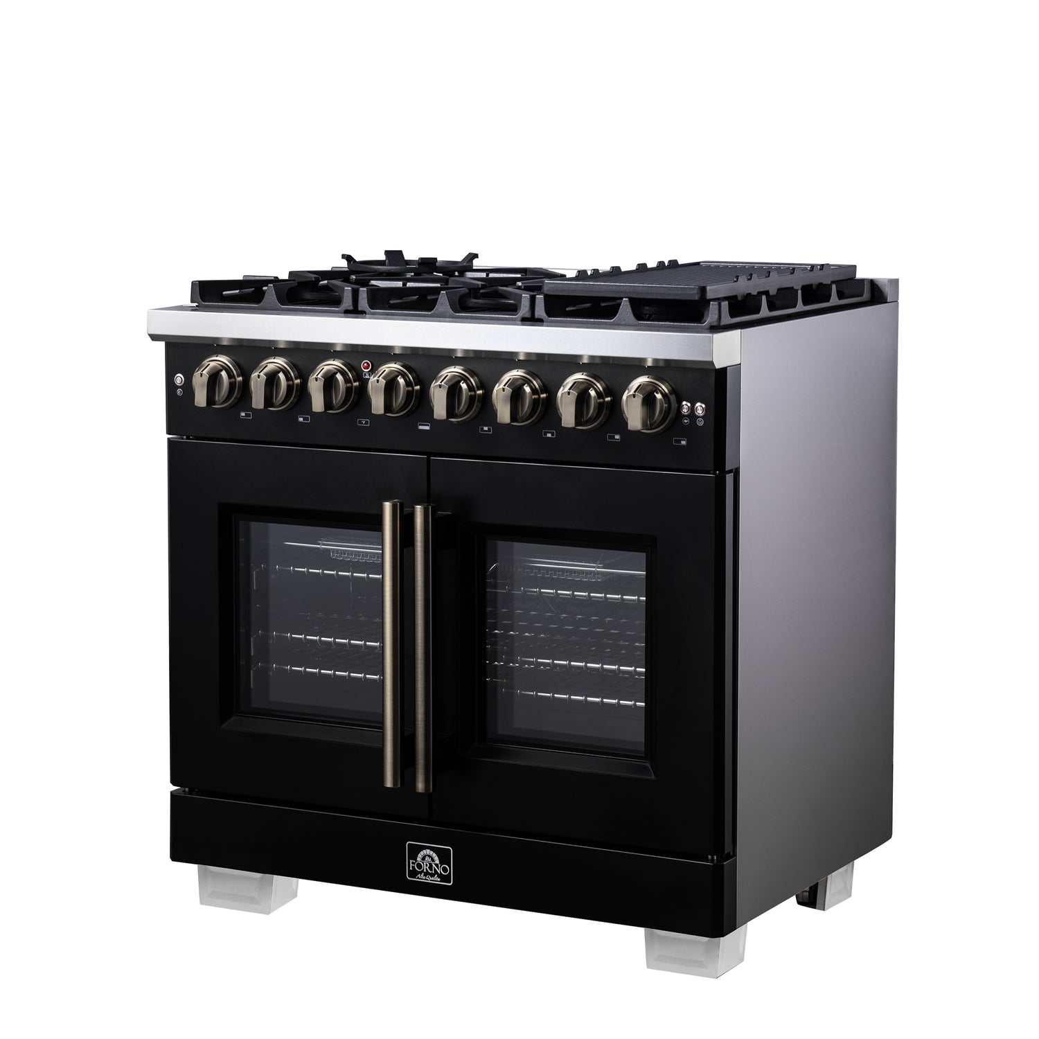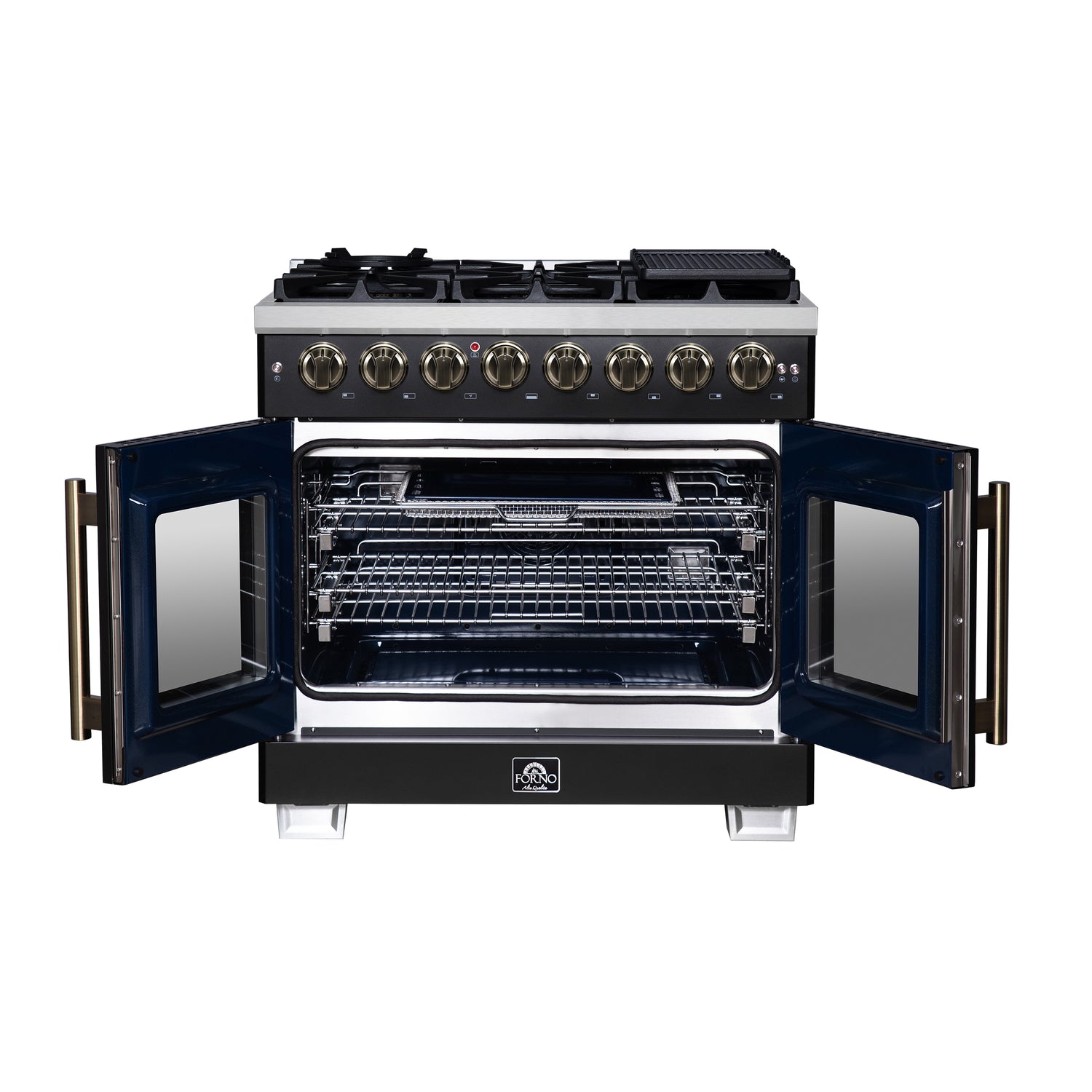 The Forno Capriasca 36 Inch Freestanding French Door Dual Fuel Range in black with antique brass accessories brings professional-grade performance and timeless styling to your kitchen. Its signature French doors open outward, providing up to 12 inches of additional clearance for easier, safer oven access. The cooktop features six sealed dual-ring brass burners with a total output of 120,000 BTUs, including a powerful burner ideal for rapid boiling, high-heat searing, or gentle simmering. Heavy-duty continuous cast iron grates provide stability and effortless movement of cookware, while the recessed black enamel cooktop cavity helps contain spills for quick cleanup. Inside, the spacious 5.36 cu. ft. electric oven delivers 6,300 watts of cooking power with true convection, ensuring fast, precise, and consistent results. A speckled blue enamel interior offers durability and easy maintenance, while the triple-layer glass oven door ensures heat retention with clear visibility. Premium accessories, including three stainless steel telescopic oven racks, LP conversion kit, wok support, reversible griddle, rotisserie kit with skewers, and an air fry basket with rack and drip pan, make this range a complete cooking solution for every home chef.