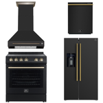 FORNO Espresso Package - 30" Electric Range, Wall Mount Range Hood, 36" Refrigerator with Water and Ice Dispenser and Dishwasher in Black with Antique Brass Accents, AP4-6012BLK-A17