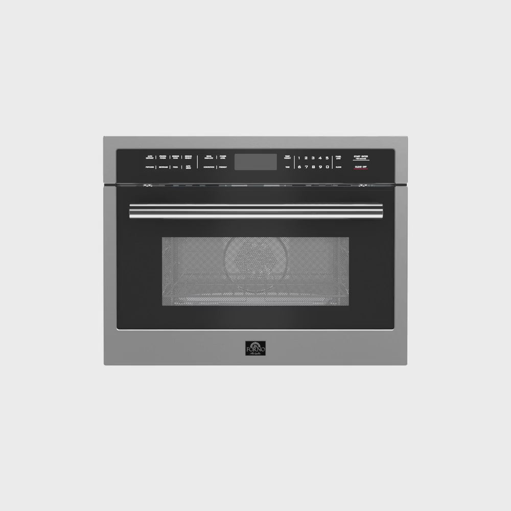 The Forno Oliena 24" Microwave & Convection Oven combines sleek design with versatile functionality, making it an essential addition to any modern kitchen. Its durable stainless-steel interior ensures easy cleaning, while intuitive glass touch controls and an LCD display provide effortless navigation. With 1,000 watts of microwave power, it heats food quickly, boiling water in just 1 minute and 50 seconds. Switch to convection mode for even cooking with 1,700 watts of true convection, or utilize the 1,750-watt broil and 600-watt bake functions for perfectly cooked meals without using your main oven. Sensor cooking, auto menu options, and specialized modes like defrost, popcorn, and beverage heating enhance convenience. The rapid preheat feature minimizes wait times, so your dishes are ready faster. Designed for performance and efficiency, this combination microwave oven offers precision and speed for all your cooking needs.