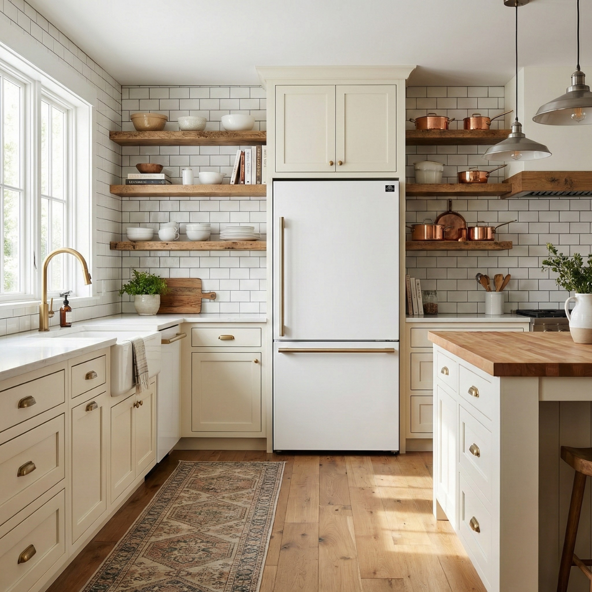 Introducing the Forno 31" 17.2 cu. ft. Refrigerator and Bottom Freezer in White with Antique Brass Handles. This stylish and spacious appliance seamlessly combines functionality with elegant design, offering you a reliable and aesthetically pleasing addition to your kitchen.