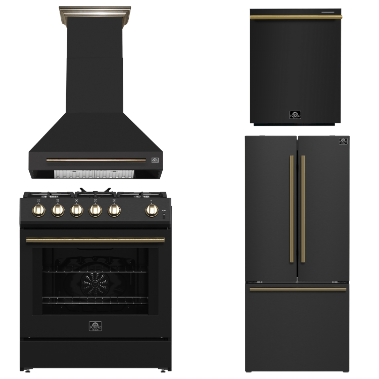FORNO Espresso Package - 30" Gas Range, Wall Mount Range Hood, 30" Refrigerator and Dishwasher in Black with Antique Brass Accents, AP4-1116BLK-A16