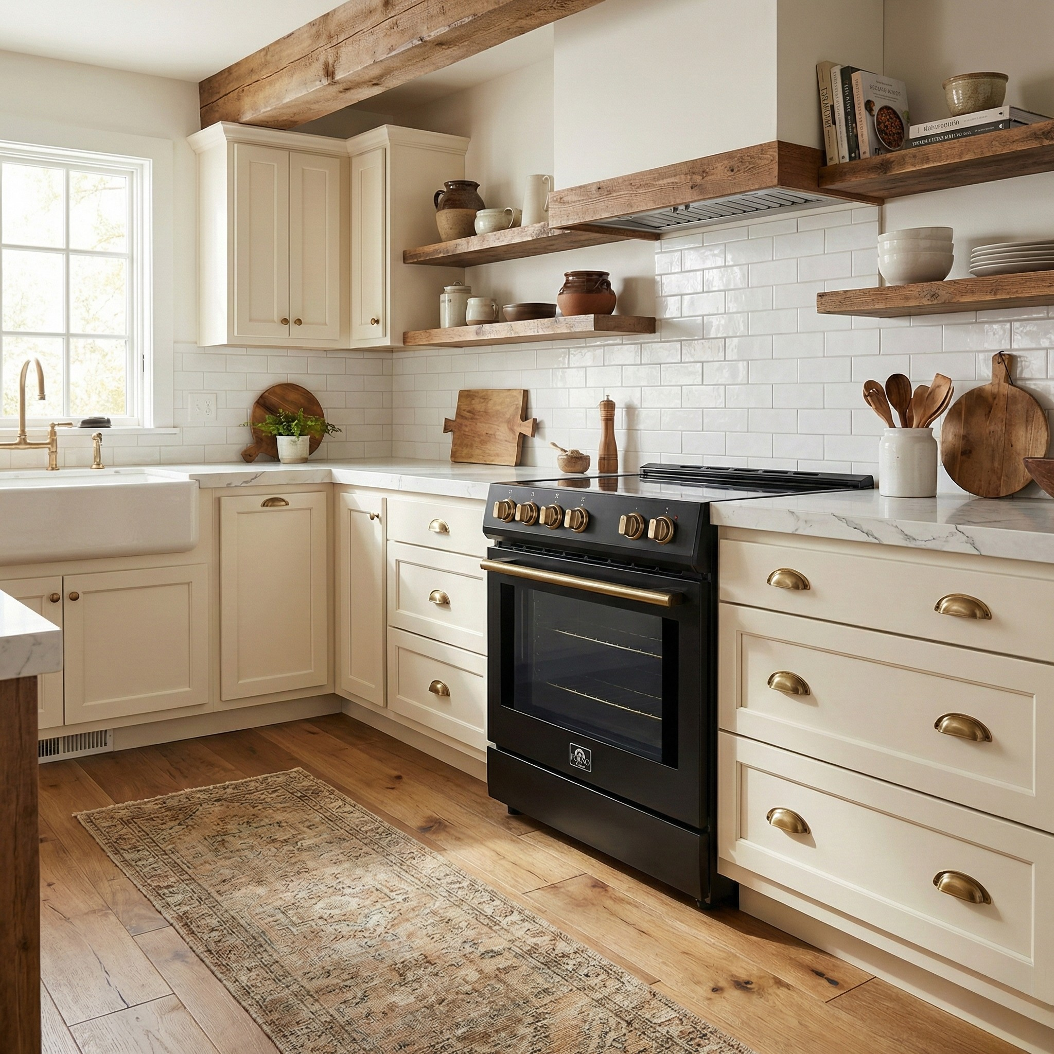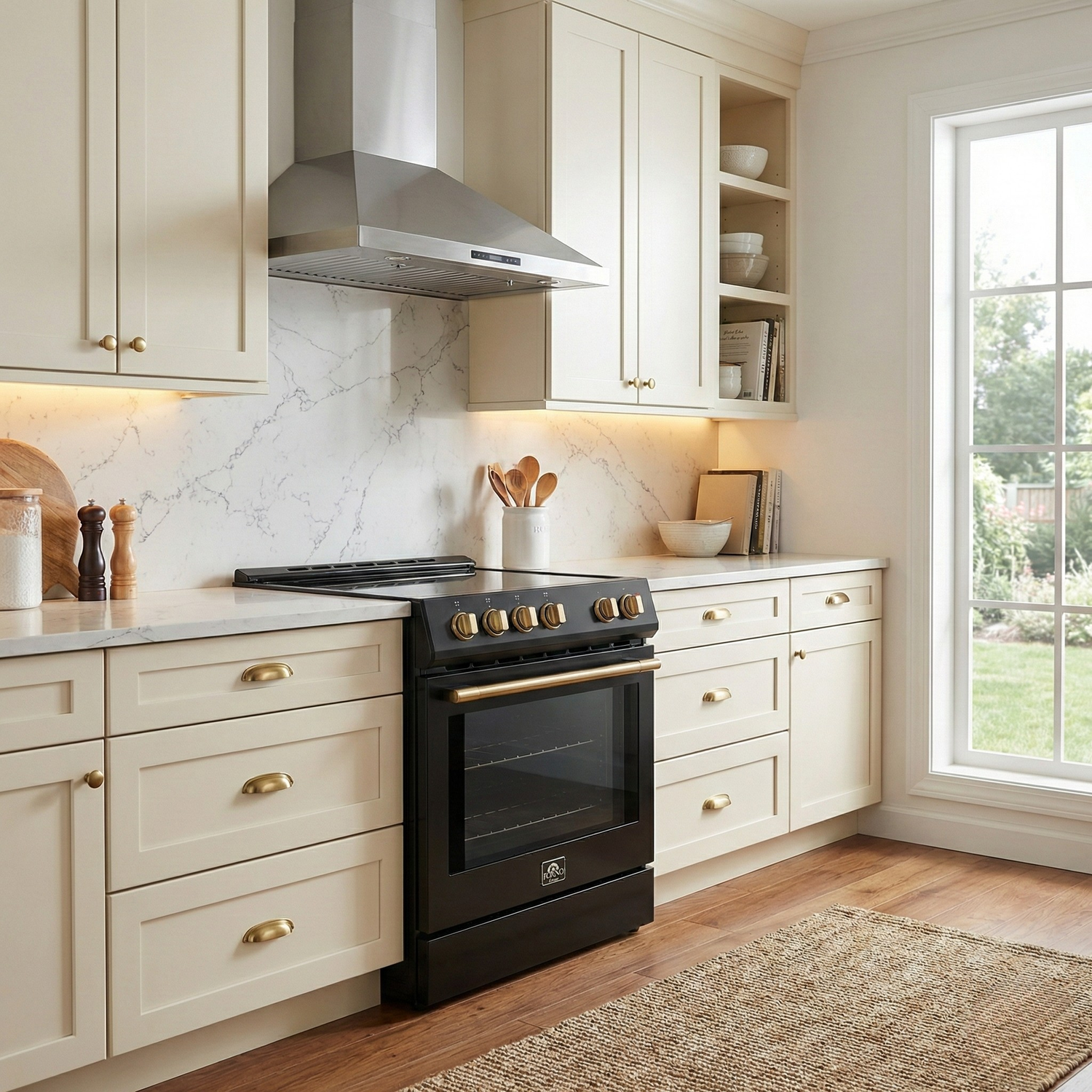 Upgrade your kitchen with the Forno Scalo 30" Microwave in Black with Antique Brass Accents. Designed for efficiency, it has a powerful 300 CFM vent fan and 1.6 cu.ft. interior. The LED touch control panel offers various cooking modes. Its sleek stainless steel finish resists fingerprints and comes with a 2-year warranty. Forno - making premium appliances affordable.