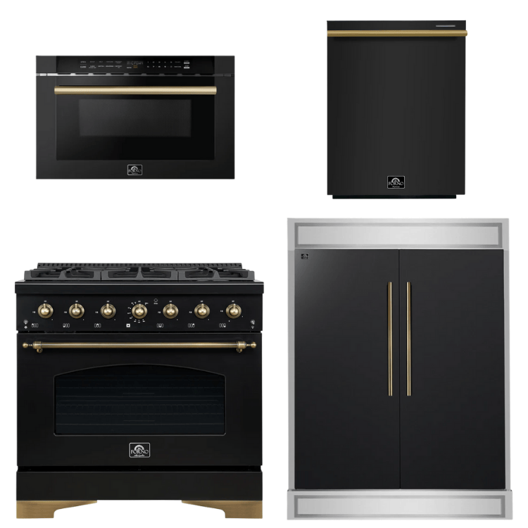FORNO Espresso Package - 36" Dual Fuel Range, 60" Refrigerator, Dishwasher, Microwave in Black with Antique Brass Accents