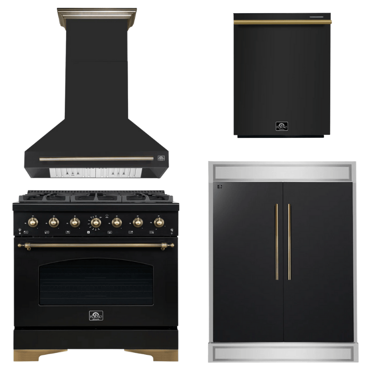 FORNO Espresso Package - 36" Dual Fuel Range, Range Hood, 60" Refrigerator, Dishwasher in Black with Antique Brass Accents
