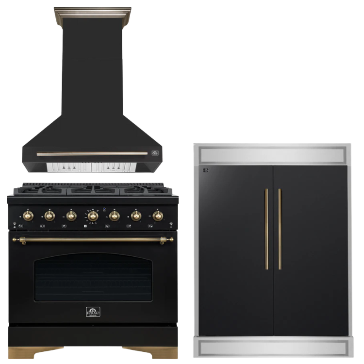 FORNO Espresso Package - 36" Dual Fuel Range, Range Hood, 60" Refrigerator in Black with Antique Brass Accents